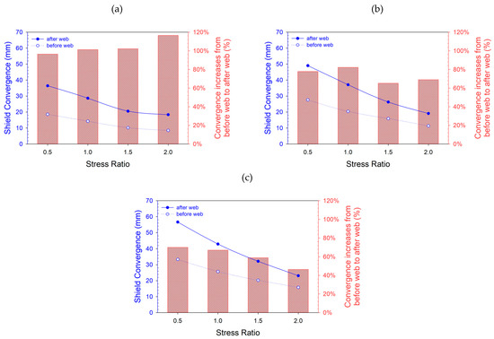 Shield convergence under the influence of stress ratio: (a) 100 m, (b) 200 m, (c) 300 m.