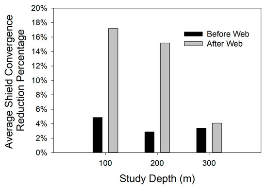 The total shield convergent also reduces when compared to prior adopting the countermeasure (Figure 12). The shield convergence for the longwall face during the before web period can be seen to slightly reduce around 3% to 5%. During this period, face-to-tip distance is relatively small in both cases prior and subsequent to the adopting of the proposed countermeasure. As a result, this slight reduction of shield convergence is expected. A significant reduction can be found after web, where face-to-tip distance is relatively larger. Shield convergence during this stage reduces on average about 17%, 15%, and 4% for the depth of 100 m, 200 m, and 300 m, respectively. This indicates that shield convergence is more sensitive to the strength of the roof as higher reduction can be achieved in shallower depths where the rock is relatively weaker.