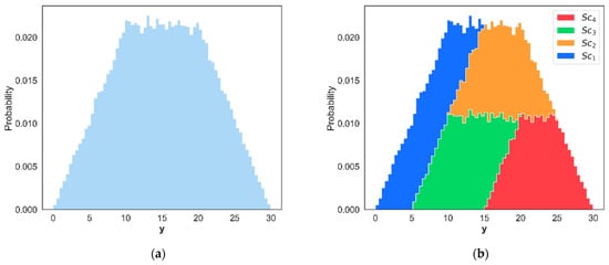 Figure 3. Probability distribution of simulation output for example problem: (a) output full distribution, and (b) decomposed distribution based on scenarios.