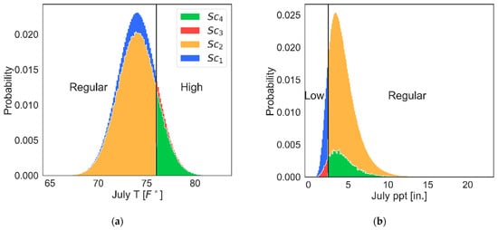 After setting up the IFEW model, Monte Carlo simulations are performed using Latin hypercube sampling (LHS) []. The LHS sampling method ensures that the input parameter ranges are represented appropriately. The input parameter states and boundary details are presented in Table 4. For July temperature, any temperature above 76 °F is considered to be under state high where all other temperature values are considered to be under state regular. Similarly, for July precipitation, any precipitation value below 2.5 in. is labeled under state low precipitation and all other values are under state regular. Table 5 presents the scenarios based on a combination of states. The parameter states are selected to produce some of the extreme condition scenarios (e.g., Table 5 dry condition).