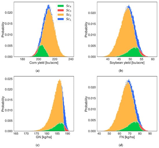 Figure 5 shows the decomposed distribution of corn and soybean yield along with the variation in FN and GN values. The effect of different scenarios due to combinations of weather parameters can be clearly seen in crop yield distribution. It is interesting to note that in dry condition (Sc3) corn yield drops compared to the yield in regular condition, whereas higher soybean yield is observed in dry condition compared to the regular condition. The computation of GN is influenced by both corn and soybean yield values (Figure 5c). The computation of FN is only influenced by soybean yield values (Section 2.2); thus, the FN distribution is observed to be similar to soybean yield distribution.