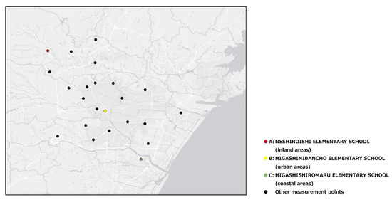 Among the 23 points, point A was selected as a typical point of the inland area, point B was a typical point in the urban area, and point C was a typical point in the coastal area. Point A was located approximately 26 km from the coast, point B was located approximately 13 km from the coast, and point C was located approximately 4 km from the coast. Sendai is different from coastal cities, such as Hong Kong, because the urban area of Sendai is not close to the coastline; therefore, point B (~13 km away from the coast) is defined as an urban area or city center.