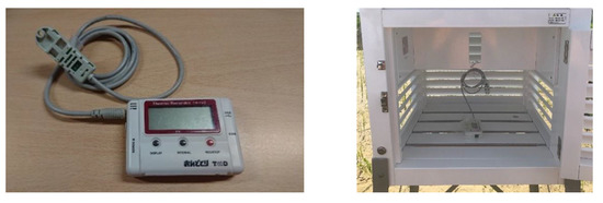 Data loggers with temperature and humidity sensors were installed on thermometer screens in multiple elementary schools and parks in Sendai City, and the measurements were performed under natural ventilation (Figure 1). The measuring instrument was a temperature and humidity recorder (T&D Corporation) (Figure 2). The test area was located as far away as possible in a place that could ensure all-day sunshine and avoid an unsuitable setting (e.g., the shade of trees). Among the collected data, the data from 22 August 2012 were used as the main analysis object.