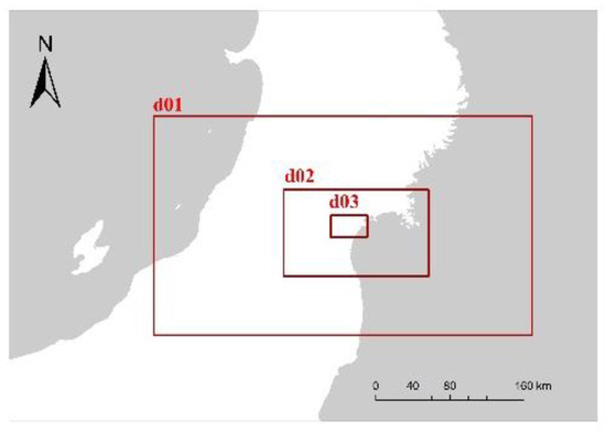 The Weather Research and Forecasting (WRF) model is a regional meteorological model developed by the National Centers for Environmental Prediction (NCEP) and the National Center for Atmospheric Research (NCAR). In recent years, this model has been applied in the fields of meteorology, architectural engineering, and agronomy. It has also been used for various research purposes in the field of built environments, such as future climate prediction and climate reproduction at the urban domain level. The WRF model can arbitrarily set data (e.g., land use, topography, atmosphere, and sea surface water temperature), and the grid size of the data must be considered according to the scope of calculation. The authors of [26] used the WRF model to simulate the future climate scenario of the Sydney area. The authors of [27] simulated the wind speed in the North Sea and Baltic Sea using the WRF model and found that the difference between the simulated and observed values was very low (3.2%). Thus, many studies have investigated the relationship between sea breezes and urban environment; however, little research has been undertaken regarding the extent of the impact of sea breezes on cities and the corresponding positive and negative impacts.