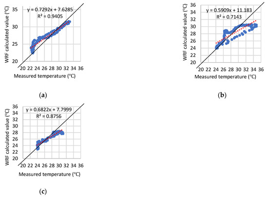 As shown in Figure 5, a strong correlation was observed between the measured temperatures at any location and the calculated values of the WRF model. The correlation was particularly strong in coastal areas and strong inland areas. Although there were many underestimated values for the WRF calculations in the metropolitan area, a strong correlation was observed overall.