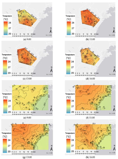 Distributions of the measured at 9:00(a), 11:00(b), 13:00(c) and 16:00(d) and WRF modeled temperature data at 9:00(e), 11:00(f), 13:00(g) and 16:00(h).