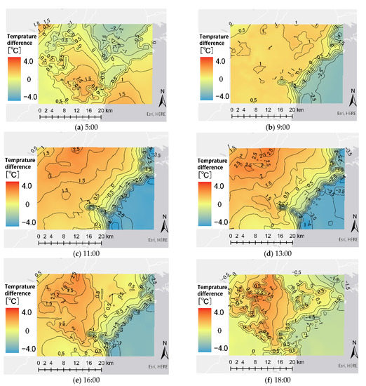 At 5:00, the temperatures values were relatively high in the city and by the sea, whereas they were particularly low in the north (Figure 7). However, from 9:00 onwards, the temperatures were positive in all areas except the coastal areas and seaside, and the temperature difference increased from 11:00 onwards. At 13:00, the temperatures showed positive values from the city to the inland area, especially in the inland area, which exceeded the average value (>2.5 °C). In addition, the range of ±0 expanded in coastal areas. At 16:00, the temperatures in the city and inland surrounding areas decreased, and by 18:00, the temperature gap decreased in all areas except the city and inland center area.