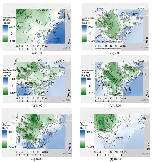 The range of the positive specific humidity difference in the coastal area increased at 16:00, and the difference between the coastal and inland areas increased. At 18:00, the specific humidity difference in some urban areas was ±0, and the specific humidity difference in areas outside the inland areas was positive.