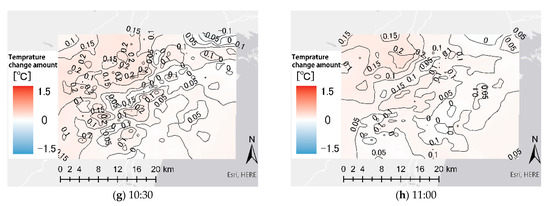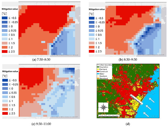 Accumulated at 1 h intervals, it can be observed that in the first hour from 7:30 to 8:30 when the sea breeze started to have an effect, the range that produced effects above 2.5 °C decreased, while the range that produced effects below 1 °C increased (Figure 13a). In addition, within the next hour (8:30–9:30), the range of effects producing less than 1 °C increased, as did the range of mitigation effects from 5 km along the coast (Figure 13b). During the next 1.5 h (9:30–11:00), a mitigation effect occurred and the affected range was within 7 km from the coastline to the inland, as shown in Figure 13c,d.