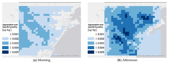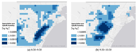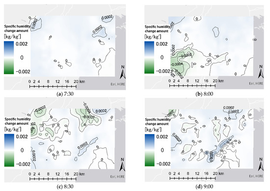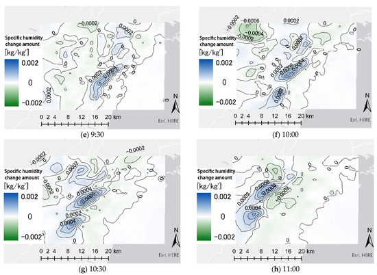 To calculate the magnitude of the specific humidity rise caused by sea breezes, we accumulated the specific humidity rise for the first 10 min of the 4 h period from 8:30 to 12:30 and 5 h period from 14:00 to 19:00. From 8:30 to 12:30, the specific humidity increased in the angle of the wind blown by the sea breeze (Figure 14a). Because the specific humidity near the land–ocean boundary was already high, the amount of increase was less, but there was an overall increase in specific humidity on the land side. From 14:00 to 19:00, an overall increase in specific humidity was observed, especially around the city (Figure 14b).