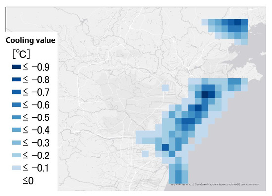 Section 3.2.3 analyzed the amount of accumulated change in cooling from 7:30 to 11:00 (Figure 11). The cumulative cooling value was only calculated for the temperature values that were negative before changing within 10 min. The result is a cooling effect close to −1 °C around the land–sea boundary next to the coast. In addition, the range with a cooling effect of −0.1 °C or more was concentrated in the coastal area, and there was no cooling effect in the urban area. The cooling range is concentrated in the coastal area and the same conclusion was obtained by T. Kaoru MATSUO et al. (2016) [31].