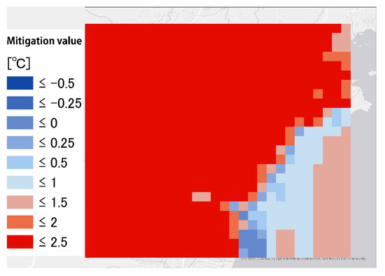 To calculate the range of the mitigation effect of sea breezes, the amount of change within 10 min was accumulated for 3 h and 30 min (7:30 to 11:00; Figure 12). Most of these locations reached a change value of 2.5 °C or more, but from the calculated duration of 3 h and 30 min, there seemed to be no mitigation effect.