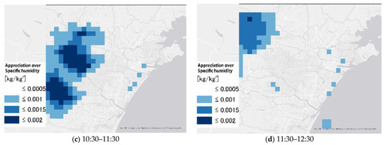 Range of specific humidity increase caused by the hourly sea breeze at 8:30–9:30(a), 9:30–10:30(b), 10:30–11:30(c) and 11:30–12:30(d).