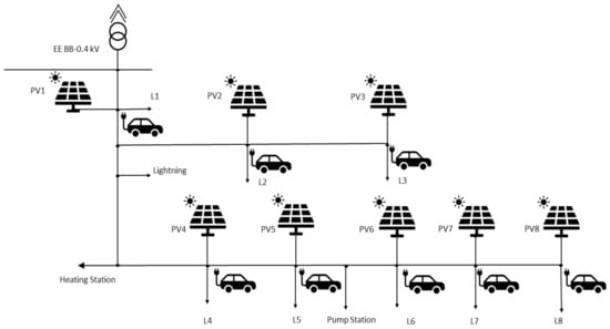 The recorder electric load data from the low-voltage distribution network is analyzed in this study. An hourly time-step of measurement was used to collect data in a rural customer for an entire year. Figure 1 illustrates the grid layout and connection topology of the low voltage grid segment under consideration. Eight residential loads are present in this segment, as well as three auxiliary loads (pump station, street lighting, and local small-scale heating plant). These residential electrical load cases constitute a small apartment/flat, medium-size house, and residential apartment building. Table 1 presents the statistical details for all eight cases. Using the measured data profiles, the peak electrical load for a small apartment is between 1 to 4 kW (Cases 1, 4, 5, 8), for a household is 5 to 6 kW (Cases 2, 5, 6) and an apartment building around 37 kW (Case 3). All these cases are summarized in Table 1 as well as their accumulated annual energy consumption.