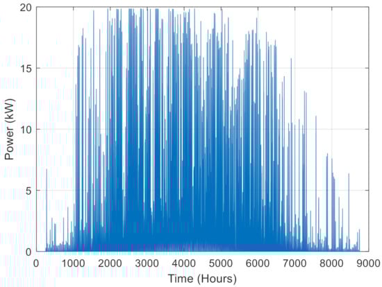 A summer day in (latitude: 58.2289) lasts on average over 16 h, while a winter day is down to 4 to 5 h []. In this study, solar PV systems with capacities of 5 kW have been proposed for a small residence, 10 kW for medium households, and 20 kW for a small apartment building. Figure 2 represents the energy output of the 20 kW PV system for the whole year, scaled from power at the measurement site.