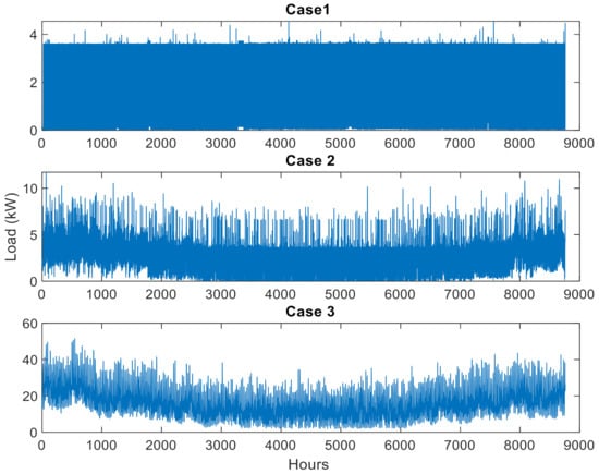 In this study, there are eight different domestic household users as defined in Section 2.1. Different numbers of electric vehicles are added to these residential users. These details are shown in Table 2. The number of EVs ranges from 1 to 10. Small apartment and household cases only have one EV and medium load cases have 2 to 4 EVs. As Case 3 is a residential apartment building, therefore, 10 EVs are integrated with it. The one-year load profile of case 1, case 2, and case 3 is also shown in Figure 3. The peak loads of cases 1, 2 and 3 are 4.6, 15.4 and 60 kW, respectively. Further details of the other cases are given in Table 3.