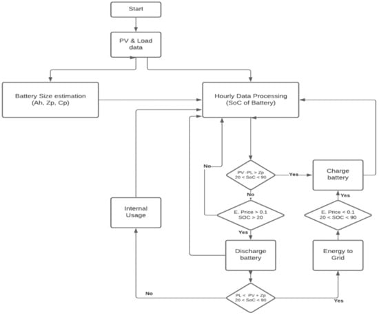 The algorithm designed for charging and discharging PV-based BESS systems and calculating battery size is shown in Figure 4. The algorithm is designed with the optimal electric energy price value target and BESS charging is only done when it is needed and the electric energy price is low. Whereas when the cost of electricity is high, batteries can be discharged to inject power into the grid and be used for in-household purposes to keep the cost of energy to a minimum. Further details of the algorithm can be found in [,].