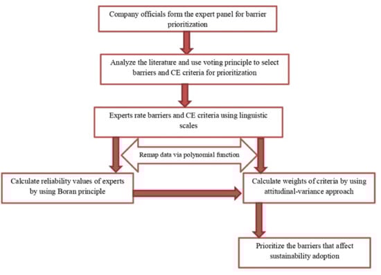 Figure 1 shows the research path that the authors attempt to adopt for prioritizing barriers that impede sustainable operations based on the CE criteria. The research problem focussed on by the authors in this paper pertains to the prioritization of barriers based on criteria by considering the rating data of order along with a matrix for the criteria weight calculation and a matrix for agents’ weight calculation by adopting polynomial functions. The latter aim to remap the data to the nonlinear context for a better understanding of the behavioral characteristics of the agents, as claimed in [29]. As mentioned earlier, nonlinear rating information is considered by the framework for decision-making. Initially, a Likert scale rating is used for rating barriers based on the criteria, and the criteria are rated by the agents. Further, the officials share their personal opinion on the agents shortlisted for the decision process. The values in these matrices are remapped to the nonlinear form by using the polynomial function [29].