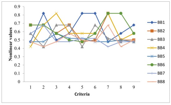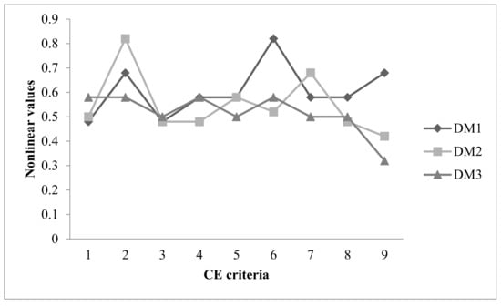 Transformed data (see Figure 3) are fed to Section 4.2 for a weight assessment of the criteria. The attitude of DMs is embedded into the rating, which is later used by the variance measure for the weight assessment of criteria. Experts’ attitude values are calculated as 0.36, 0.43 and 0.21, respectively, by adopting Equation (6). Four officials rated three experts as 0.5, 0.6, 0.2; 0.5, 0.7, 0.3; 0.5, 0.7, 0.2; and 0.4, 0.7, 0.2. The weights are determined as depicted above by converting the values to a nonlinear form and applying the Boran principle. The weights of CE criteria are determined as 0.01, 0.30, 0.017, 0.015, 0.064, 0.24, 0.14, 0.038 and 0.18, respectively by adopting Equations (7) and (8).