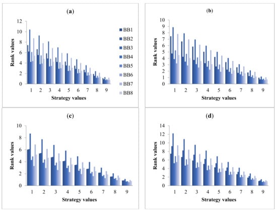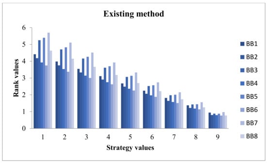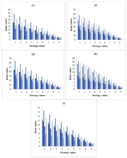 In Figure 4, there are nine bar graphs plotted as (a) to (i), and each chart is for one weight set (set 1 to set 9) that is formed by rotating the values of nine criteria weights. Every rotation provides a new weight set of the same order as that of the original weight vector, which is . In each bar graph, we alter the strategy values () in a stepwise manner from 0.1 to 0.9. Rank values associated with all eight barriers are depicted based on both the alterations of the criteria weights and the strategy values. Inter correlation deals with criteria weight alteration, and intra correlation deals with strategy values. From Figure 4a–i, it is inferred that the rank values change for barriers, but the ranking order remains intact, indicating that the proposed framework can withstand an alteration of the parameters’ values. Similarly, Figure 5 is provided for method [40], depicting the rank values associated with barriers for different strategy values, with the weight vector obtained from the case example. It can be seen that the order changes for the barriers, and hence it is inferred that the proposed model is more robust than its counterpart.