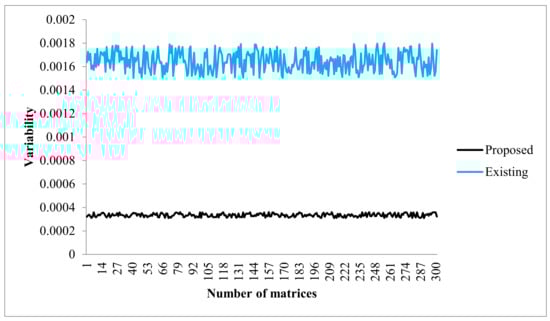 From an experimental study with 300 matrices of order and weights as calculated above, it is inferred that the proposed algorithm has an approximately 10% higher discrimination strength than the counterpart. Figure 6 clarifies this claim by plotting the variability values of the rank values of barriers produced by the proposed model and the existing counterpart methods for all 300 matrices. Initially, in the experimental study, all simulated matrices were given input to both the proposed model and the counterpart. Rank values of order were obtained for all matrices from both models. Later, the variance was calculated for these rank values, that yielded two vectors of order plotted in Figure 6 to determine the discrimination strength of the models.