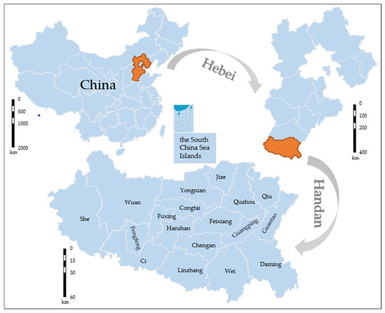 The city of Handan is located in the southernmost part of Hebei Province, China, at the eastern foot of Taihang Mountain, bordering Shandong in the east, Henan in the south, Shanxi Province in the west and Xingtai City in the north. Its jurisdiction covers 6 districts, 1 county-level city and 11 counties. Its geographical location ranges 36°04′~37°01′ N and, 113°28′~115°28′ E with warm temperate semi-humid and semi-arid continental monsoon climate. The location of the area is shown in Figure 1.