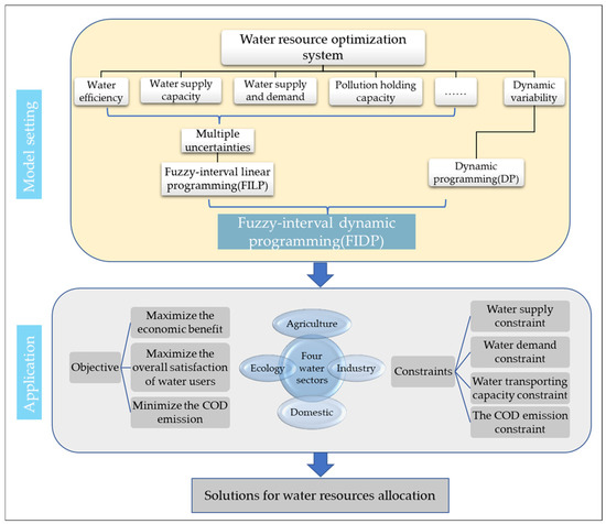Due to population growth, economic development and consumption upgrade, global water consumption has increased by six times, and it has been continuing to grow steadily at an annual rate of about 1% during the past 100 years [1]. All of these would lead to the water shortage problem that is already pessimistically even severer, and seriously hinders the sustainable development of social economy. Managing water resources is an effective way to deal with the above challenges. However, in the process of management, experts and governors have encountered a lot of problems [2,3,4,5,6], such as dynamic variability and uncertainty, which are thorny and inevitable. Besides, in areas with water shortage, when the available water cannot meet the needs, unreasonable water allocation will lead to conflicts among users [7]. Therefore, it is definitely necessary to put forward a comprehensive model to deal with dynamic variabilities and uncertainties in water resources system as well as the contradiction between different users, so as to improve the management efficiency and the users’ satisfaction.