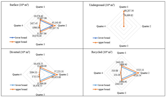 The available water supply of surface water, groundwater and diverted water in the planning year were predicted by the trend analysis method. The amount of recycled water was obtained according to the predicted regeneration rate of water consumption in the planning year. By comparing the predicted results with the water situations in recent years, it can be seen that there is similar water inflow situation in 2019. Thus, the water inflow situation of each stage in the planning year can be obtained based on the analysis of water supply proportion in 2019. 110% and 90% of the inflow were taken as the upper and lower bounds individually, and the results are shown in Figure 3.
