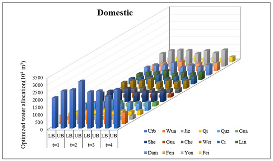 In 2030, the domestic water distribution in Handan City will be [34,907.31, 41,915.24] × 104 m3, accounting for [19.10, 19.90] % of the total water distribution. The satisfaction of domestic water use in the whole year is [93.40, 95.10] %, and it is higher than 92.00% in each stage indicating a high degree for guaranteed domestic water. With the change of temperature, the domestic water consumption at different stages also changes slightly to some extent. Specifically, the proportion of domestic water in the four stages of the planning year is [23.01, 23.44] %, [28.80, 29.00] %, [23.40, 24.10] % and [24.00, 24.40] % respectively. Obviously, the second stage consumes the most domestic water, whereas the first stage consumes the least proportion. During the planning year, the population in Urban and Yongnian will reach 3.40 × 106, and the water allocated to these two areas will be [12,953.41, 15,082.32] × 104 m3 correspondingly, accounting for [36.00, 37.10] % of the domestic water distribution to the whole city. The annual domestic water distribution in the planning year is shown in Figure 6.