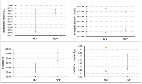 Based on the FILP model, the membership function = [0.952, 0.992], = [2171.42, 3124.16] × 108 yuan, = [75.00, 84.00] %, = [1.17, 1.85] × 108 kg, and the comparison result of two models is shown in Figure 8. It can be seen that, compared with the FILP model, the ranges of the solution results of the FIDP model are reduced in different degrees, making the results more specific and accurate. In detail, the of the FIDP model is not only reduced in scope, but also presents increases in its overall value, with its upper bound and lower bounds increased by 0.10% and 3.30% respectively. For and , not only the ranges of their value are reduced by 23.90% and 38.20%, but also their lower bounds are increased by 93.30 × 108 yuan and 0.06 × 108 kg respectively, which are more accurate. The value of in FIDP model is improved by 12.50%, which will alleviate the conflicts between local government and users, and among different users more effectively. Consequently, it can be concluded that FIDP model proposed in this paper performs better and is more suitable for the optimization of water resources allocation in this area.