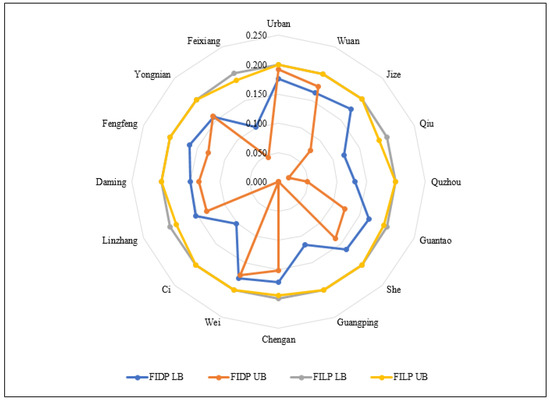 The water distribution scheme of FILP model is shown in Table 6, and the water shortage rate of the two models is compared in Figure 9. As presented in Table 6, the total water distribution of the FILP model is [167,643.11, 205,259.94] × 104 m3, which is reduced by [7769.43, 13,951.80] × 104 m3 compared with the FIDP model. As the water distribution decreases, the corresponding water shortage rate will be [19.70, 20.00] %, with an increase of [5.10, 9.10] % compared with [10.60, 14.90] % from the FIDP model. Compared with FILP, the water shortage rate from FIDP has declined in all regions, especially in Qiu, Quzhou, Guangping, Ci and Feixiang, with a decrease of [7.90, 16.70] %, [7.00, 15.00] %, [8.30, 20.00] %, [9.90, 20.00] %, and [9.80, 14.30] % respectively. Therefore, the model has good applicability to water resources allocation in water-scarce areas.