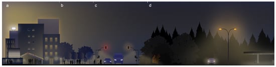 A schematic diagram that illustrates the extent of artificial lighting in four different scenarios: urban, peri-urban, rural, and natural landscapes. (a) Architectural lighting in urban areas illuminates buildings, façades, architectural structures, and monuments. In some scenarios, it is accompanied by commercial and retail advertisements in the form of backlit panels, self-illuminated sources, and decorative lighting for non-permanent events. (b) Pole-mounted luminaires and bollards provide visibility for pedestrian and cycling paths at night for public amenity areas and neighboring urban zones, such as parks. (c) Street lighting is used for the safe passage of pedestrians and cyclists and to also assist in visibility for vehicular circulation at night. (d) In natural environments, lighting on roads and motorways aids vehicular travel. In addition, stopover locations, such as gas and train stations, as well as villages with rural houses, become illuminated spots at night. Source: Authors’ figure.
