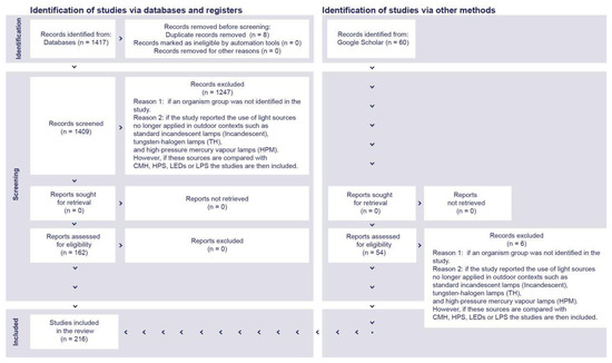 The titled and abstracts of records were screened, and then the full texts of studies were reviewed to identify, order, and aggregate the results as follows: (a) an organism group defined as the main study subject, (b) the reported light source used, (c) the reported physical properties of artificial lighting, and (d) a response, multiple responses, or no response to ALAN. Six researchers participated in the screening assessment of Table 2 and Figure 4, Figure 5, Figure 6, Figure 7, Figure 8 and Figure 9. One researcher performed a double screening of the studies to properly identify the results and to assess the content in Figure 4, Figure 5, Figure 6, Figure 7, Figure 8 and Figure 9 and the Supplementary Materials. Two researchers performed an additional screening of the studies to properly translate the results taken into account for Figure 4, Figure 5, Figure 6, Figure 7, Figure 8 and Figure 9 and for the Supplementary Materials. Three researchers screened and assessed the appropriateness of the summarized content for Figure 4, Figure 5, Figure 6, Figure 7, Figure 8 and Figure 9. A final screen was performed by all researchers for Figure 4, Figure 5, Figure 6, Figure 7, Figure 8 and Figure 9.