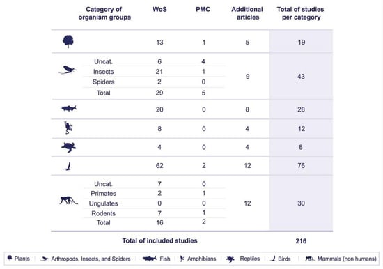 A total of 216 studies were identified. These studies included behavioral and physiological responses in plants [59,60,61,62,63,64,65,66,67,68,69,70,71,72,73,74,75,76,77]; arthropods, including insects and spiders [71,78,79,80,81,82,83,84,85,86,87,88,89,90,91,92,93,94,95,96,97,98,99,100,101,102,103,104,105,106,107,108,109,110,111,112,113,114,115,116,117,118,119]; fish [120,121,122,123,124,125,126,127,128,129,130,131,132,133,134,135,136,137,138,139,140,141,142,143,144,145,146,147]; amphibians [148,149,150,151,152,153,154,155,156,157,158,159]; reptiles [160,161,162,163,164,165,166,167]; birds [168,169,170,171,172,173,174,175,176,177,178,179,180,181,182,183,184,185,186,187,188,189,190,191,192,193,194,195,196,197,198,199,200,201,202,203,204,205,206,207,208,209,210,211,212,213,214,215,216,217,218,219,220,221,222,223,224,225,226,227,228,229,230,231,232,233,234,235,236,237,238,239,240,241,242,243]; and non-human mammals, including bats, primates, rodents, and marsupials [24,160,161,174,244,245,246,247,248,249,250,251,252,253,254,255,256,257,258,259,260,261,262,263,264,265,266,267,268,269], when their habitats, aquatic or terrestrial, were artificially illuminated with direct or indirect emissions of ALAN (i.e., all light sources of artificial light). The results of our systematic review show that the most studied organism groups exposed to night-time illumination were birds (76 studies); arthropods, insects and spiders (43 studies); non-human mammals, including bats, primates, rodents, and marsupials (30 studies); fish (28 studies); plants (19 studies); amphibians (12 studies); and reptiles (8 studies). A total of 4 studies are doubled marked as these present results for more than one group (e.g., results for birds and mammals) [71,160,161,164].