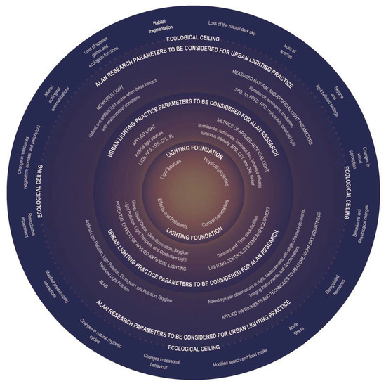 ALAN research acknowledges lunar cycles and starlight, the interaction of ALAN and natural nocturnal light with environmental conditions (e.g., cloud cover or snow [37,38]) as important, and it recognizes ALAN as a potential anthropogenic pollutant. This means that in order to consider sustainable objectives [39], a collaborative framework between ULP and ALAN research is needed to potentially establish a common ground. A mutual understanding between domains can clarify terminologies to carefully communicate and efficiently transfer scientific research on the night-time environment and the lighting approaches used in the practice to assess solution-oriented systematic learning [40,41,42].