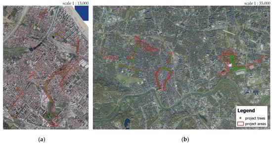 Experimental design of measured tree and shrub species in Rimini (a) and Krakow (b).