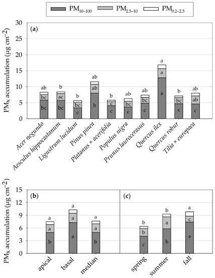 In general, Quercus ilex had a higher PMx accumulation per unit leaf area than other species, regardless of the PM fraction (Figure 2a).