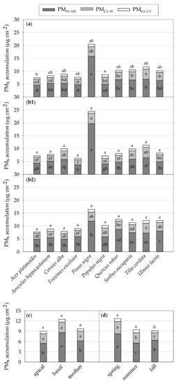 PM10–100, PM2.5–10, and PM0.2–2.5 accumulation per unit leaf area (µg·cm−2) in Krakow by the different species (a) in parks (b1) and streets (b2) with different leaf positions (c) and seasons (d). Within each variable, different letters indicate significant differences among species, species and strata, and leaf positions and seasons at p ≤ 0.05.