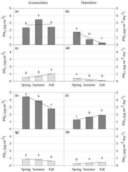 PM10 accumulation (a,e) and deposition (b,f) and PM2.5 accumulation (c,g) and deposition (d,h) per unit leaf area in Rimini and Krakow, respectively. Within each variable, different letters indicate significant differences among seasons at p ≤ 0.05. The dotted line represents the annual trend.