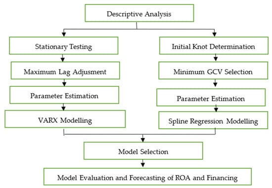 After we form the best VARX model and spline regression for ROA and financing, the next step is to choose the best model between the VARX model and spline regression for use in forecasting. Model selection is done by looking at the resulting RMSE value on VARX and spline regression. We do the forecast using models formed from all training and testing data. We forecast data for July 2021–July 2022. In general, the research steps can be written as shown in Figure 1.
