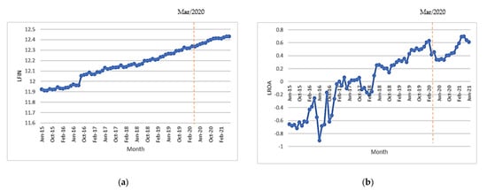 To understand the behavior of both financing and ROA, we first studied their trend and possible structural change especially due to the COVID-19 pandemic. Note that we worked on the log-scale of financing and ROA, respectively named LFIN and LROA (See also Section 2.1). Figure 2 shows that LROA and LFIN have a clear increasing trend, which indicates that Indonesia Islamic Commercial Bank would handle their role as an intermediation institution properly over a long-term period. However, according to the fluctuations, both variables have a pattern that undergoes structural changes. Structural change of LFIN seems to only occur in September 2016 mainly due to the increasing of community savings and deposits which triggers the banks to improve the distribution of financing to the community []. We observe that the pattern of LFIN does not show an obvious change during the pandemic, which might indicate that the amount of financing is still under control during the pandemic. At least two reasons could explain this finding: (1) Some debtors received financing during the pandemic but were approved before the pandemic, and (2) Islamic Commercial Banks continue distributing financing during the pandemic, but consider applying stricter rules and are more selective in terms of grant debtors and sectors []. Meanwhile, structural changes of LROA have occurred in many periods, especially during the pandemic when LROA dropped from March 2020 to November 2020 (Figure 2b). This could be due to the financing restructuring policies during the pandemic such as delays in payment installments and margin payment waivers for debtors or companies that are affected by the pandemic []. Thus, the profit of Islamic Commercial Banks reduces, leading to the decreasing of ROA.