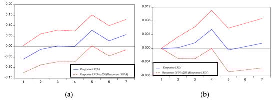 The reciprocal influence between LFIN and LROA is conducted using impulse response presented in Figure 3. First, LFIN shock in a month will be responded to positively by LROA 5 months later (Figure 3a), meaning that the profit of financing will impact on ROA at least 5 months after the financing is granted. Second, LROA shock in a month will be responded to positively by LFIN in 2 months until 4 months later, indicating the profit earned by Islamic Commercial Banks in a month can be optimized to increase financing at least two months after the banks obtain profit. An increase in ROA shows that there has been an increase in the profit of the banks by assuming assets of the banks are fixed. With good profitability, the bank will have more liberty to provide financing to debtors because the bank has good liquidity. Our findings are in line with the previous studies [,,,], but this reciprocal influence between ROA and finance of Indonesia Islamic Commercial Bank could be the first one available in the literature.