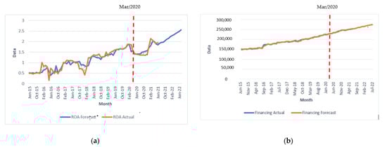 Time series plot of actual data and forecast value of (a) ROA and (b) financing of Islamic Commercial Banks in Indonesia.