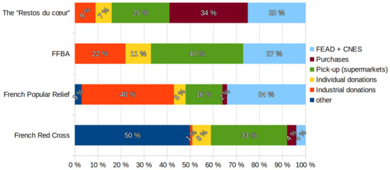 Distribution of foodstuffs according to their origin for the four historical associations in France (data aggregated from [16]). FEAD—Fund for European Aid to the Most Deprived; CNES—Crédit National des Épiceries Solidaires (French National Solidarity Grocery Credit); FFBA—Fédération Française des Banques Alimentaires (French Federation of Food Banks).