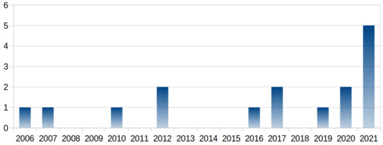 Indeed, a systematic literature review through Scopus with the request “TITLE-ABS-KEY (knowledge AND management AND food AND aid AND (logistics OR (supply AND chain)))” led to identifying only twenty-one articles that were published between 2006 and 2021, the majority of which at the end of this period. After studying their abstracts, we excluded five irrelevant articles (children interest in healthier food, sheep production, etc.) and noted ten articles focusing on food supply (FS), six on knowledge management initiatives (KM), four on humanitarian aspects of food supply (Hu.), four on food waste (FW), but only one on sustainable development and one on food donation. Table 1 presents a summary of this literature. It should be noted that the interest of academics in knowledge management and food aid logistics altogether as a whole is quite recent (2006) and has particularly grown in 2021 (see Figure 3), probably due to the COVID-19 outbreak.