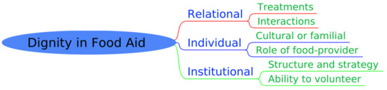 Very recently, Herrington and Mix [60] proposed a study on the social construction of dignity through daily food experiences in a food aid community. Through qualitative interviews and ethnographic field study, they observed that, when discussing experiences related to dignity construction, individuals perceived three “social arenas”: (1) relational, (2) individual, and (3) institutional (Figure 4). Such a pragmatic analysis of dignity construction in food aid definitively appears relevant to better understand the initiatives we studied in France. These three social arenas resulting from qualitative and field studies from Herrington and Mix [60] will now be detailed.
