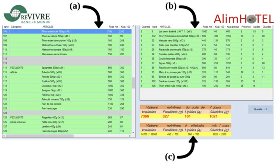 The AlimHotel decision support system supporting the preparation of parcels: foodstuffs’ base (a), current selection (b), calorie calculation, and balance check (c).