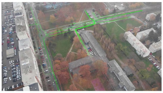 As outlined in [21], the volume of current data on pedestrians and cyclists is very limited. One of the main reasons is that collecting reliable pedestrian data is often labor-intensive and time-consuming [28]. Vehicular tracking is a more mature application [29]. The majority of research on drone data collection has been focused on vehicle trajectories, traffic evaluation, and driving behavior [24]. Nevertheless, its unique features make this technology a promising alternative tool for mapping the trajectories of pedestrians and cyclists. It can also be used to detect conflicts between these two groups. Airborne cameras can capture complex traffic situations, including pedestrians and cyclists.