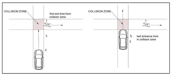 Post-encroachment time is defined as the time between one vehicle leaving and another vehicle entering a collision zone (see Figure 2). PET is considered a suitable safety indicator for predicting potential collisions at pedestrian crossings [37]. Post-encroachment time can be calculated by [38]: