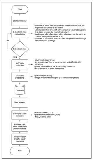 The scheme of the proposed methodology for evaluating child traffic safety near primary school areas using UAVs is presented in Figure 3.